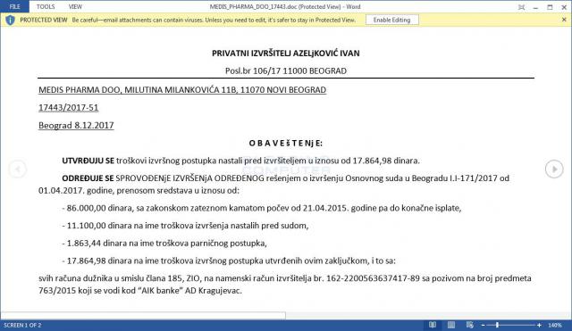 U privitku e-mail poruke nalazi se Word dokument koji sadrži makro naredbu koja prilikom izvršavanja preuzima zlonamjerni softver s udaljenog poslužitelja, pohranjuje je na lokalno računalo i pokreće ransomware na računalu.